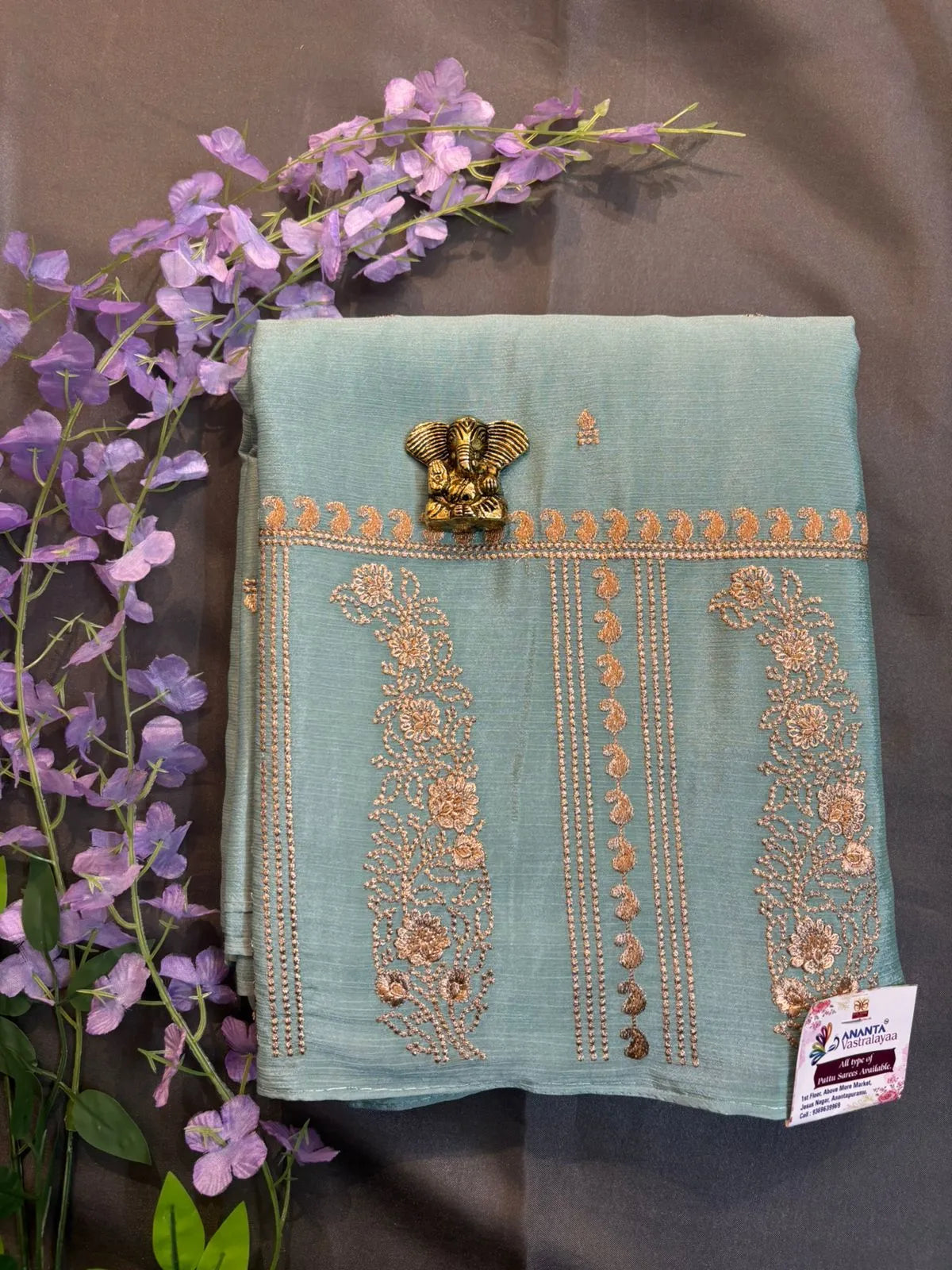 Work: Gold zari embroidery work border with all over zari buttas.